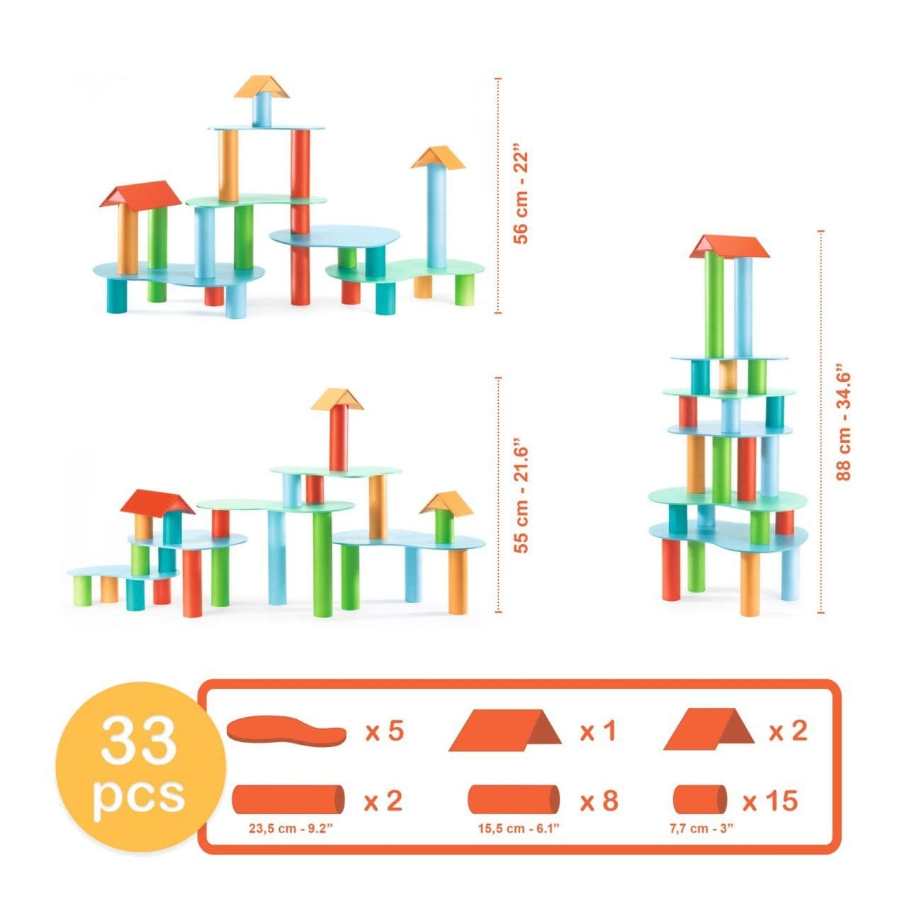 Joc de construit cu tuburi si placi Tubulo Tublo este un joc de construcție și imaginație pentru vârsta de 4 ani și peste. Tuburi și plăci în toate culorile, pentru construcții fără sfârșit. Simplu, puternic și stabil. Cei mici construiesc decoruri pe care apoi le populează cu figurinele lor preferate. Dezvoltă capacitatea de a aranja obiecte într-un spațiu, concentrarea, dexteritatea și echilibrul. Conținut: 28 tuburi de carton + 3 acoperișuri de carton + 6 plăci de lemn.Vârsta recomandată: +4 ani.Fabricat din carton certificat FSC® și lemn. Conform reglementărilor EN71&ASTM. AVERTISMENT: Contraindicat copiilor sub 3 ani. A se utiliza sub directa supraveghere a unui adult. Producător: Djeco, Franța.
