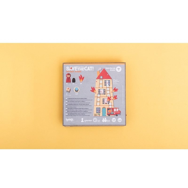 Pompierii salveaza pisica, joc de cooperare și strategie – varianta de buzunar Ajută-l pe pompier să stingă focul și salvează pisoiul prins pe acoperiș! În acest joc devenim pompieri și lucrăm împreună pentru a stinge incendiile și a ajunge pe acoperișul unde este prinsă pisicuța. Va trebui să fim cu ochii în patru și să gestionăm bine apa. Jucându-ne de-a pompierul exersăm luarea deciziilor în echipă, număratul și răbdarea. Formatul de buzunar, practic pentru călătorii. Ilustrație Can Seixanta Ambalat în cutie robustă din carton.Conține tabla de joc puzzle (26 x 47 cm), figurina pompier, figurina pisica, 9 piese foc, 12 token-uri numere, zar din lemn. Pentru 2-6 jucători.Vârsta recomandată: 4 – 8 ani.Confecționat din hârtie FSC și carton reciclat. Conform reglementărilor EN71&ASTM.AVERTISMENT: Contraindicat copiilor sub 3 ani. Se recomandă supravegherea copilului de către un adult în timpul jocului.Produs de Londji în Spania.