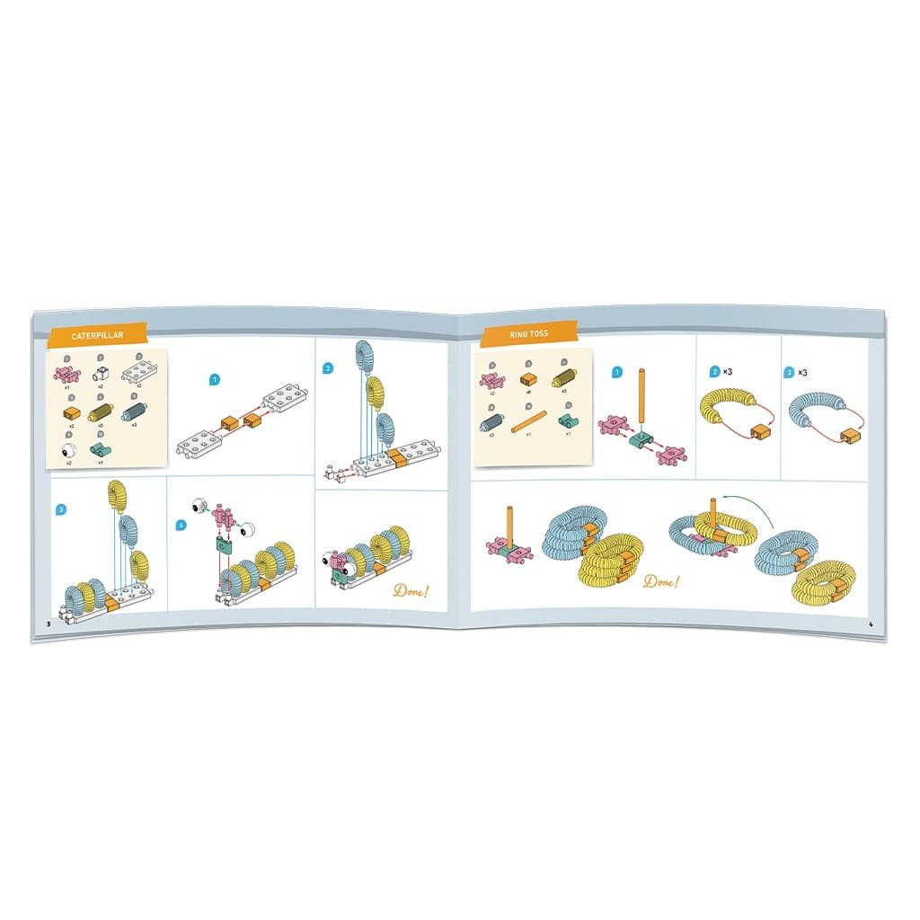Kit STEM de construit cu tuburi flexibile Întinde! Îndoaie! Piesele FLEXI-TUBE pot fi întinse și rotite, făcând modelele mai dinamice, organice și distractive. Copiii vor asambla 7 modele diferite, fiecare legat de experiențele lor de viață, inclusiv omizi, roboți și caracatițe. Pot realiza un joc cu inele pentru a-l juca cu prietenii sau pot crea personaje imaginare. În timpul asamblării, copiii vor dezvolta concepte spațiale și logice pe măsură ce fac legătura între instrucțiunile 2D și lumea 3D. Asamblarea îi ajută, de asemenea să-și dezvolte abilitățile esențiale de motricitate fină pe măsură ce îndoaie, răsucesc și creează modelele. Având multe modele de construit, copiii pot dezasambla și reasambla din nou și din nou, dând frâu liber creativității și experimenând un sentiment de împlinire. Componentele Flexi-tube deschid noi căi pentru design și joacă. Culori pastelate. Pupilele mobile fac globii oculari să prindă viață. Copiii se vor bucura să exploreze expresia emoțională prin jocul de rol. Piesele din această trusă sunt compatibile cu piesele altor truse de construcție Gigo Primii Pași (Kids first). Conține 27 piese, 7 modele, manual cu instrcțiuni. Potrivit pentru copiii cu vârste începând de la 18 luni. Confecționat din plastic. Conform reglementarilor EN71&ASTM. AVERTISMENT: Contraindicat copiilor sub 12 luni, conține piese mici. Se recomandă supravegherea copilului de către un adult în timpul jocului. Citiți instrucțiunile înainte de utilizare, urmați-le și păstrați-le pentru referință. Produs in Taiwan de Genius Toy sub brandul Gigo Toys. Manual Kit STEM de construit cu tuburi flexibile, Gigo Toys – descarca aici fisierul
