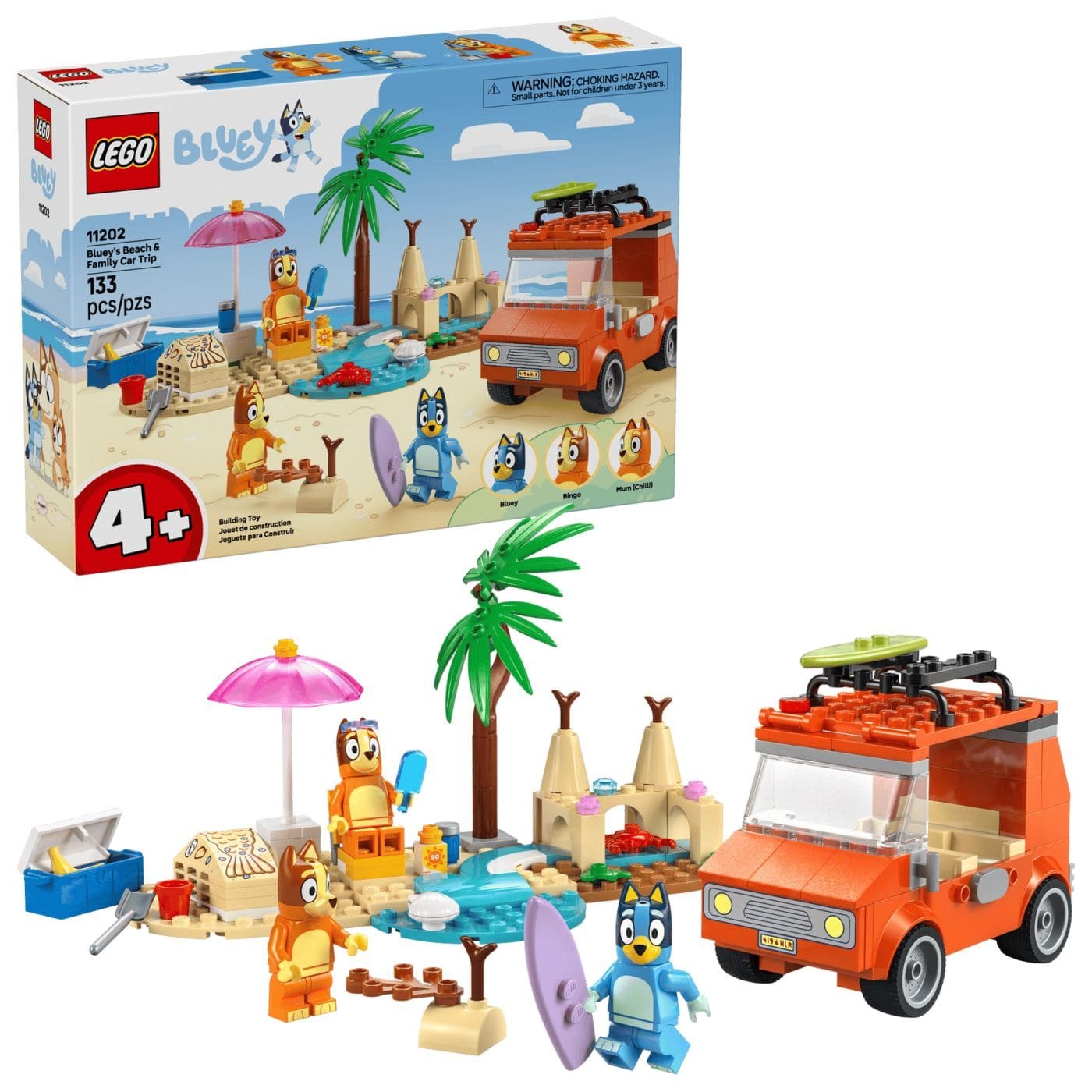 Calatoria familiei lui Blue cu masina la plaja (11202) ii prezinta pe Blue, Bingo si mama Chilli cum impacheteaza masina pentru o zi plina de distractii la plaja. Aceasta jucarie interactiva pentru fanii serialului TV Blue este ideala pentru copiii in varsta de 4 ani si mai mari, oferind momente de joaca nelimitate in timp ce isi dezvolta abilitatile creative si de rezolvare a problemelor. Aceasta jucarie LEGO vine cu vehiculul iconic din serialul Blue, cu 2 placi de surf atasate pe plafon si un portbagaj in spate pentru a depozita lada frigorifica. Plafonul detasabil al masinii le ofera copiilor acces usor la interior, unde sunt locuri pentru minifigurinele Blue, Bingo si Chilli. Dotarile de plaja care inspira la joaca includ un castel de nisip impresionant, o coada de sirena din nisip in care poate sa incapa o minifigurina, un scaun rabatabil, o umbrela de plaja si un palmier. Accesoriile includ de asemenea si un crab, o inghetata, ochelari de soare si crema de protectie solara. Cu o Placa de baza mare care da startul la distractie si o brosura cu instructiuni colorata, seturile LEGO pentru varstele de 4 ani si mai mari sunt modalitatea ideala pentru ca adultii si copiii sa se distreze in mod creativ impreuna.