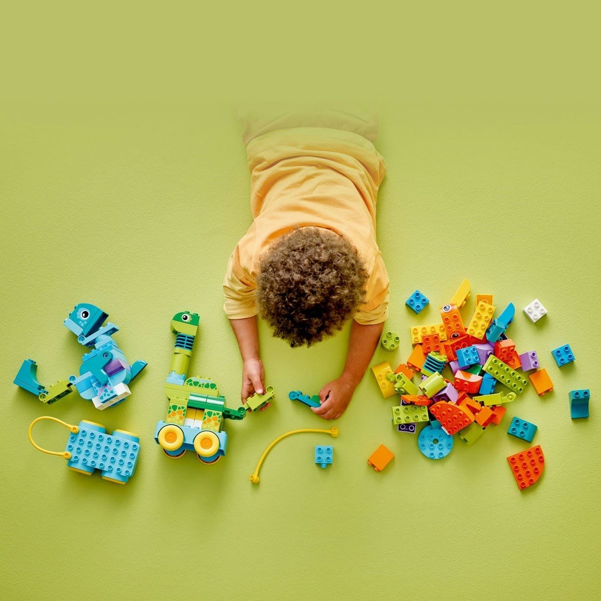 Distractia din timpul sesiunilor de joaca a micilor constructori poate sa inceapa cu setul Dinozauri pe roti 3 in 1 (10451). Plin cu posibilitati de joaca creativa, aceasta jucarie educationala cu dinozauri de construit vine cu o varietate de caramizi colorate pentru a crea chiar 6 dinozauri deosebiti. Cele 108 de caramizi si piese din acest set LEGO® DUPLO® cu animale se asambleaza in 3 moduri diferite Diplocodus si T. Rex, Triceratops si Stegozaur sau Pteranodon si Parasaurolophus. Micutii pot face figurinele dinozaur si mai distractive folosind gaturi mobile, cozi articulate, aripi care flutura sau guri care se inchid si se deschid. Prescolarii isi construiesc dinozaurii pe o baza cu roti, fiind astfel un cadou grozav pentru copiii mici care adora seturile LEGO DUPLO sau vehiculele. Acest set LEGO DUPLO 3 in 1 pentru copiii mici ofera o multime de oportunitati de invatare prin joaca. Contine caramizi usor de manevrat si de desprins si ii invata pe copii despre perseverenta, concentrare si imaginatie in timp ce-si construiesc si reconstruiesc la nesfarsit animalele ingenioase.