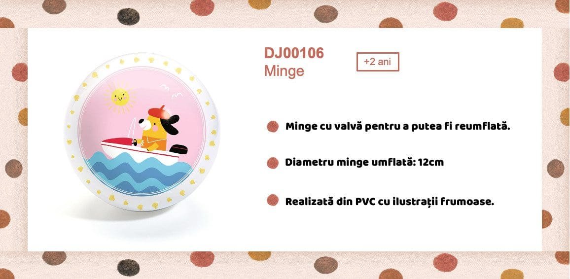 Minge barca prietenilor Este o minge mică, frumos ilustrată, care măsoară 12 cm în diametru.Pentru joaca în casă sau afară. Diametru minge umflată: 12 cm. Vârsta recomandată: +2 ani. AVERTISMENT! Contraindicat copiilor sub 2 ani. A se utiliza sub directa supraveghere a unui adult. Producător: Djeco, Franța